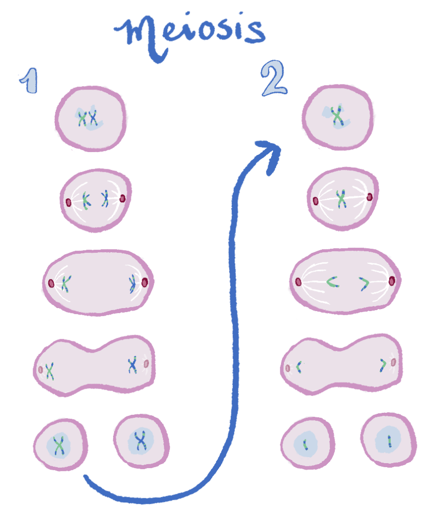 The initial cell with double the genetic information goes through cell division twice, so that eventually four unique haploid daughter cells are created! You can see the process of meiosis in the image below, where only one set of chromosomes is displayed.