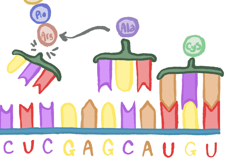 So when the messenger RNA is fully transcribed, it travels outside of the cell nucleus and floats around until a Ribosome comes by. A Ribosome is a piece of machinery that recognises sets of the nucleic bases per set of three.